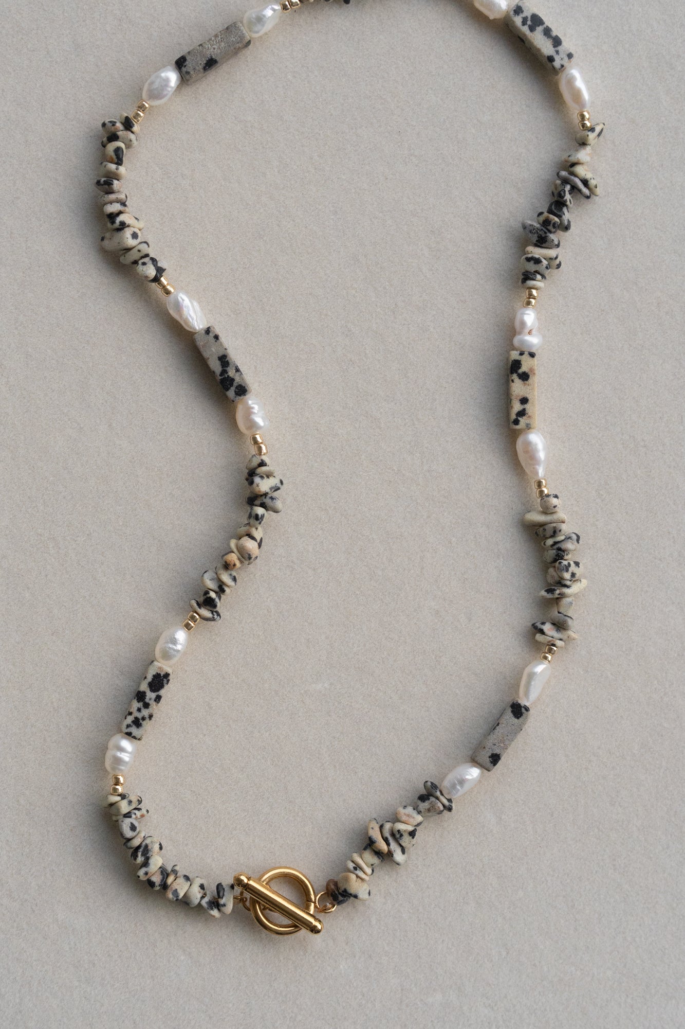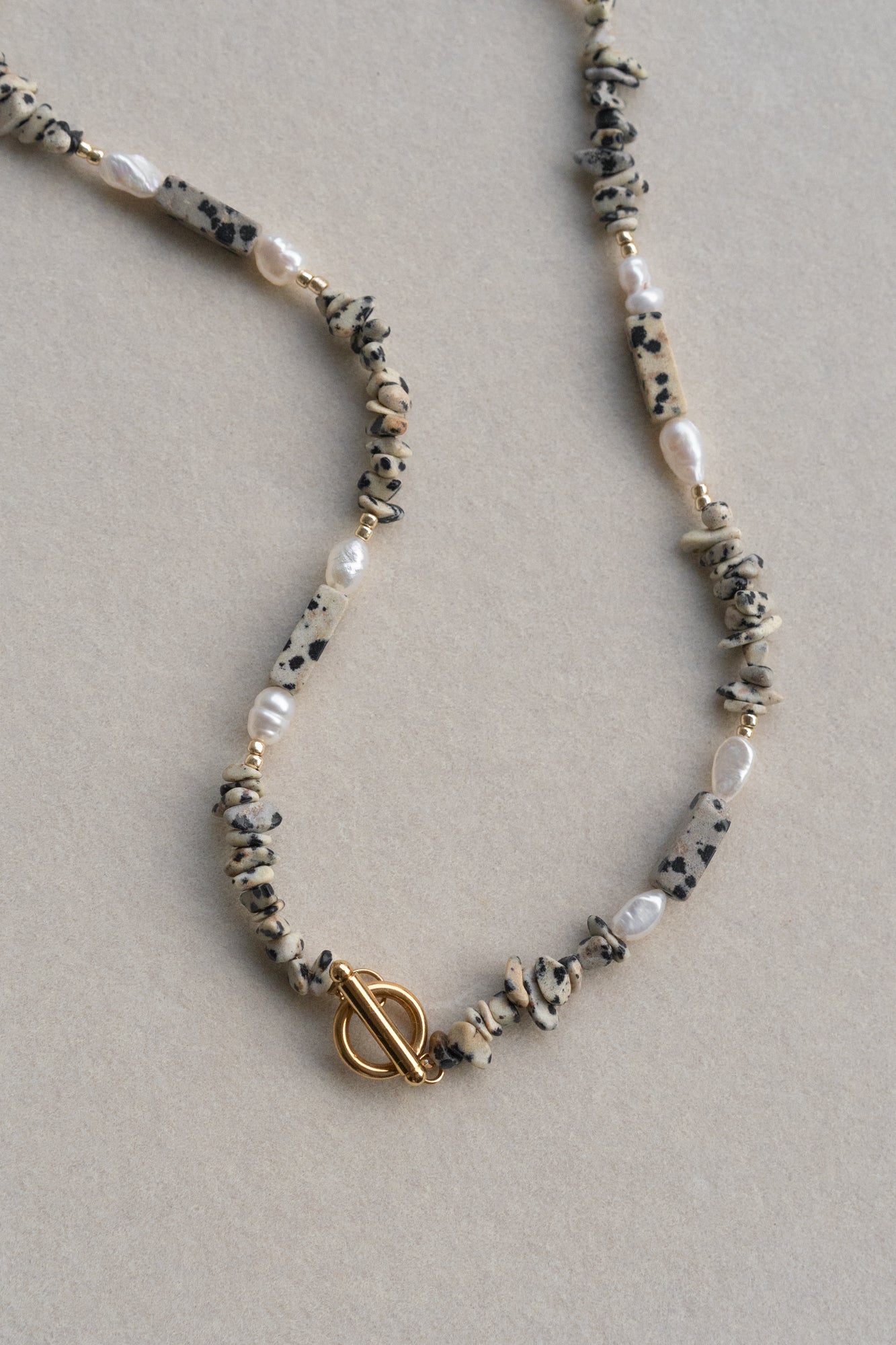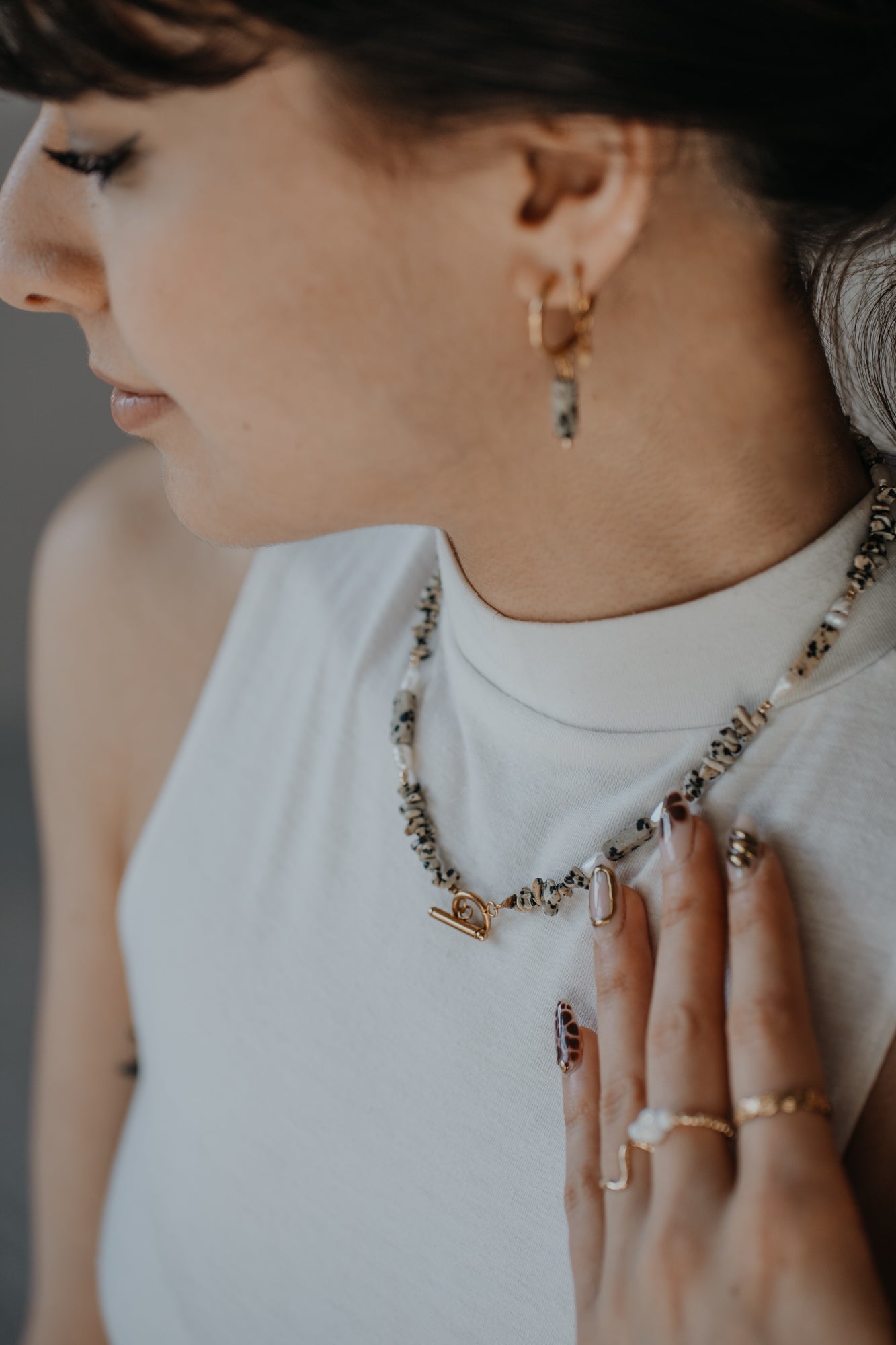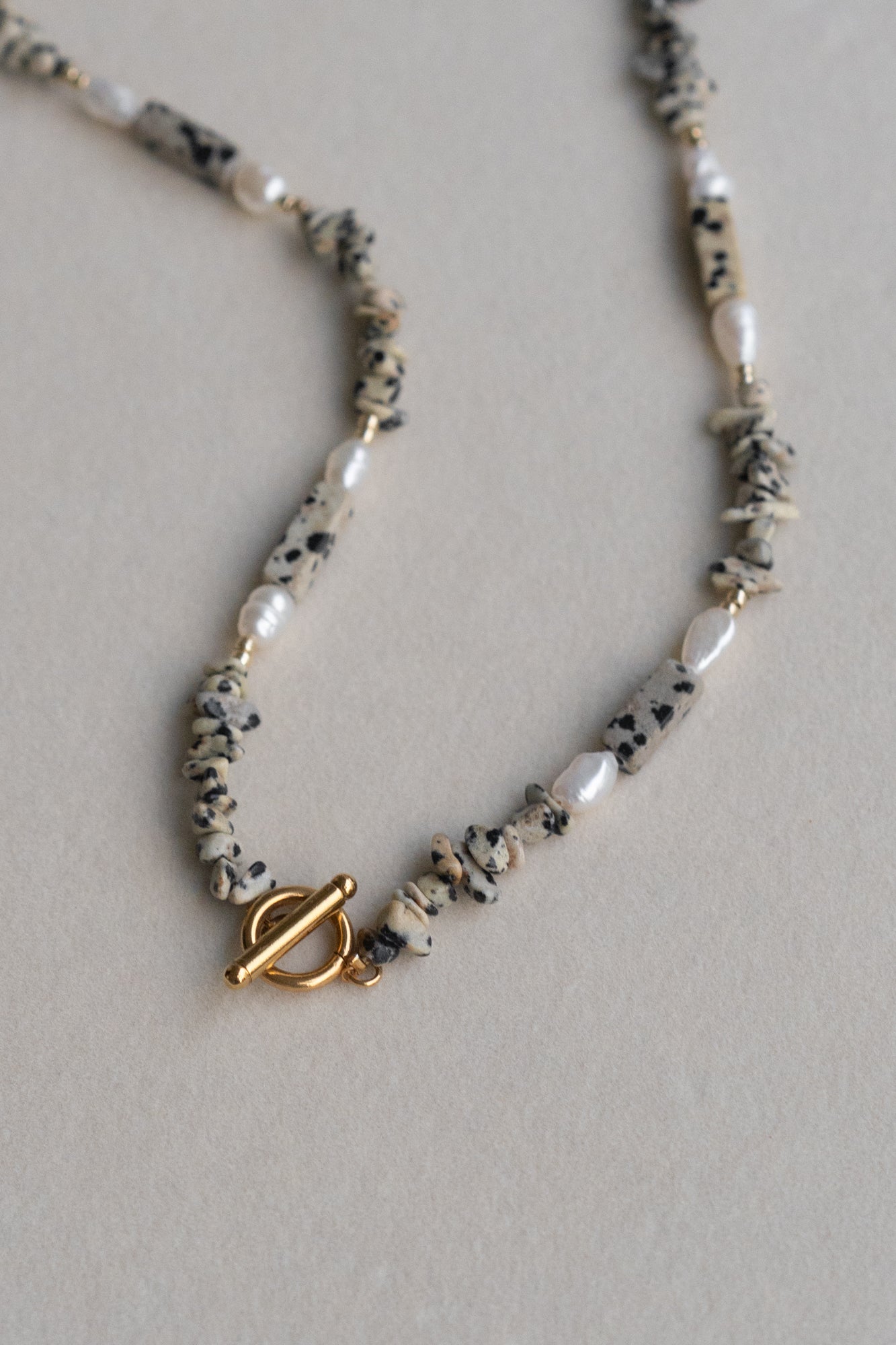 Die LEO-JASPIS Kette besteht aus echten Leoparden Jaspis-Edelsteinen und einzelnen schimmernden Süßwasserperlen. Sie ist ca. 42cm lang und hat einen Statement-Edelstahlverschluss, der vorne getragen, die Kette zu einem richtigen Statement Piece macht.